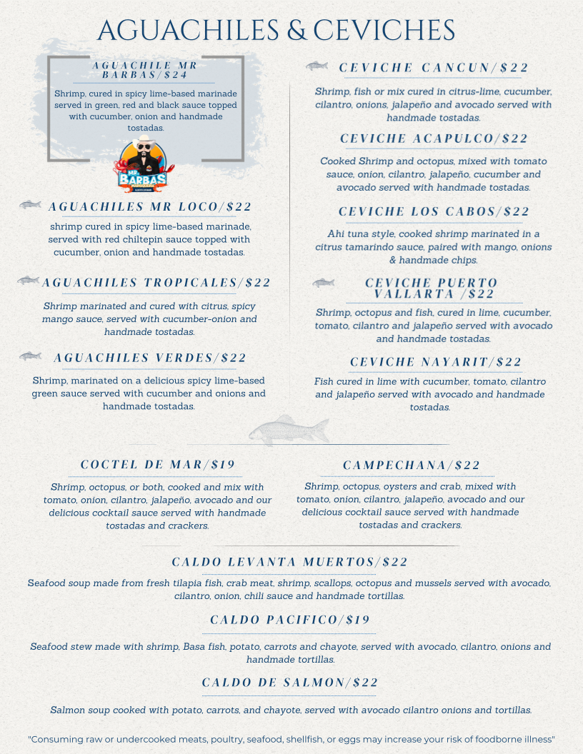 - Fajitas: Offers several types including chicken, shrimp, mixed, and specialty options such as Mar Y Tierra and Fajitas Mariachi, available in single or double servings.