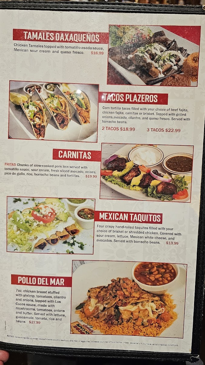 The menu features a variety of Mexican and Tex-Mex dishes suitable for breakfast, brunch, lunch, and dinner. It includes options for individual meals, sharing plates, and catering selections. Diners can choose from an assortment of classic Mexican fare along with creative combinations designed for a casual dining experience.